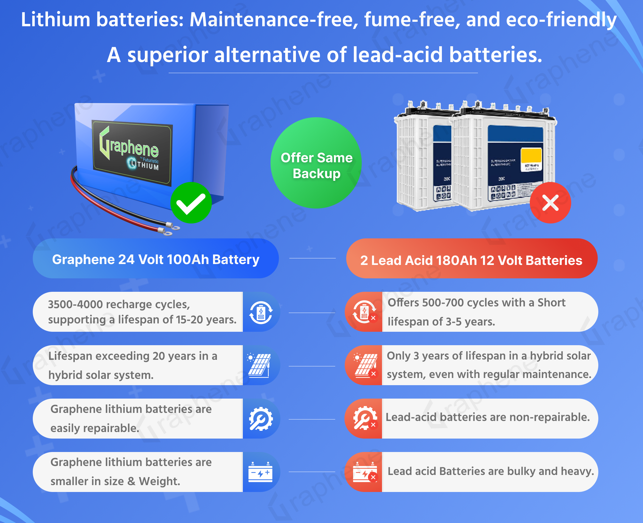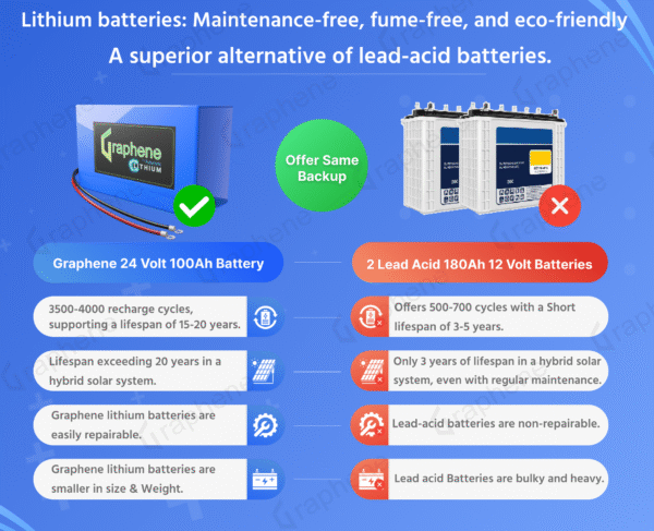 Lifespan: LiFePO4 batteries last much longer, typically 15-20 years compared to 3-5 years for lead acid.